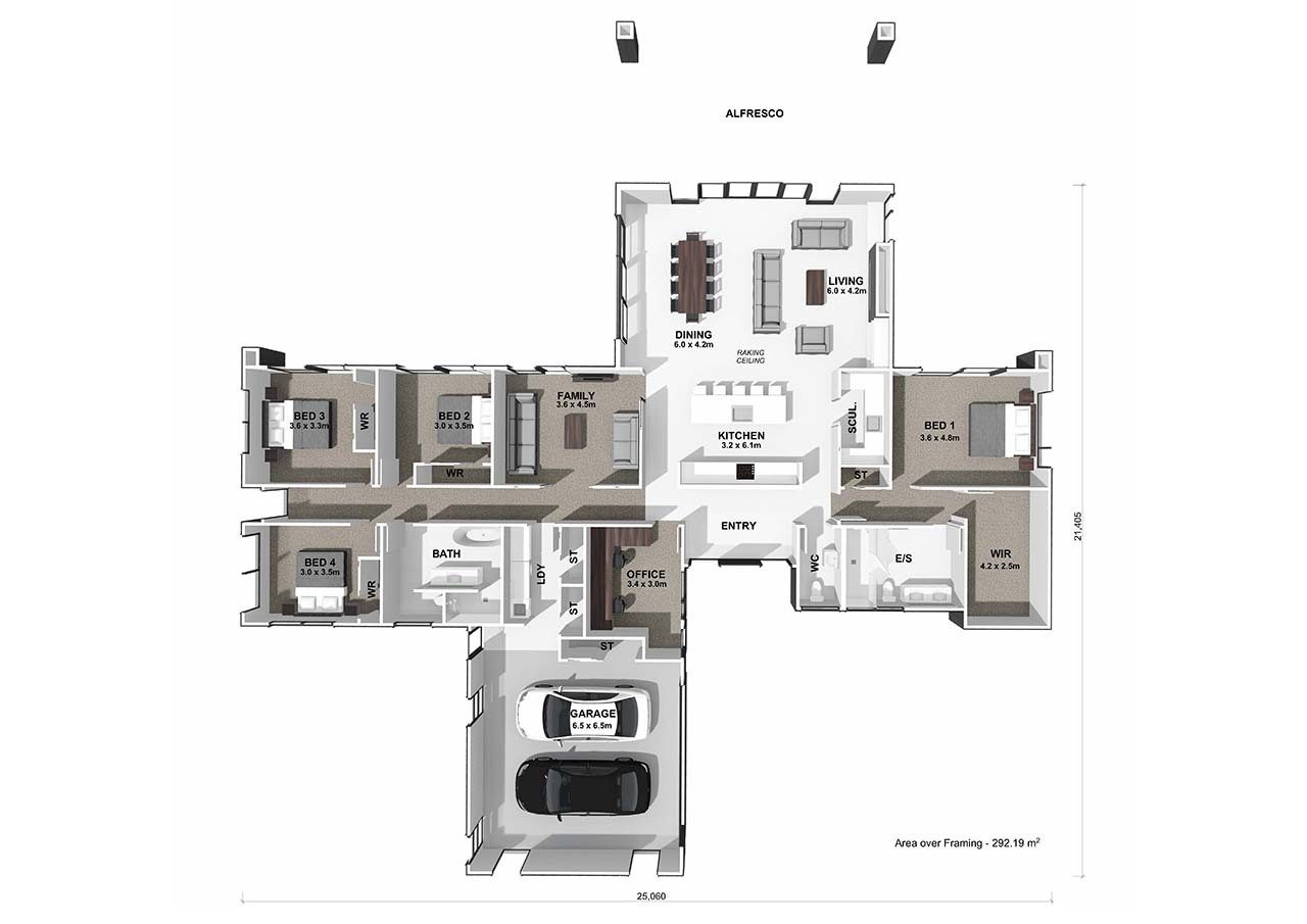 This plan can be altered to suit your specific requirements, or we can create a custom architecturally designed home to suit your budget and vision on this expansive 2507m² section.