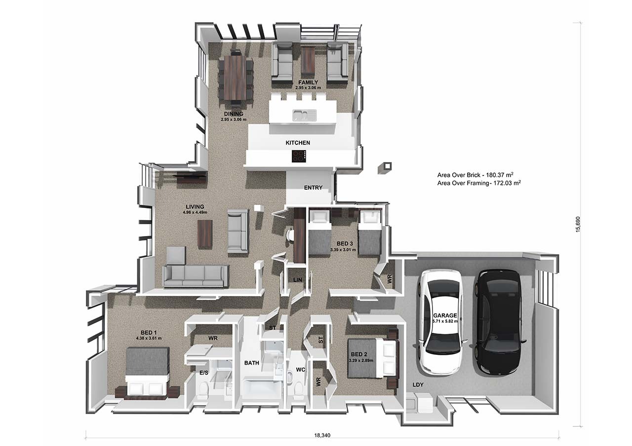 The delightful Kingston plan offers three bedrooms with an ensuite and walk-in wardrobe in the master. The galley kitchen comes fully equipped with modern appliances, while a convenient computer nook provides a functional workspace. Additionally, the spacious family and dining areas provide ample room for relaxation and entertaining. The Kingston's expansive windows and doors seamlessly blend with the surrounding environment.