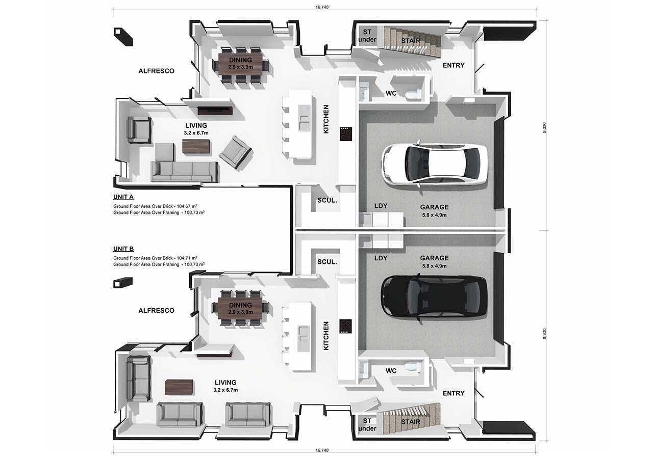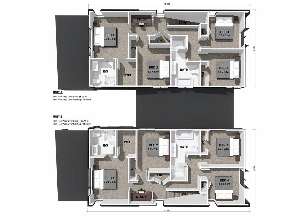 Discover the Matakana plan, a four-bedroom duplex house spread over two levels. This home features an open-plan kitchen, living, and dining area with a galley-style kitchen. Additional highlights include under-stair storage, a study, alfresco dining, and a single garage.