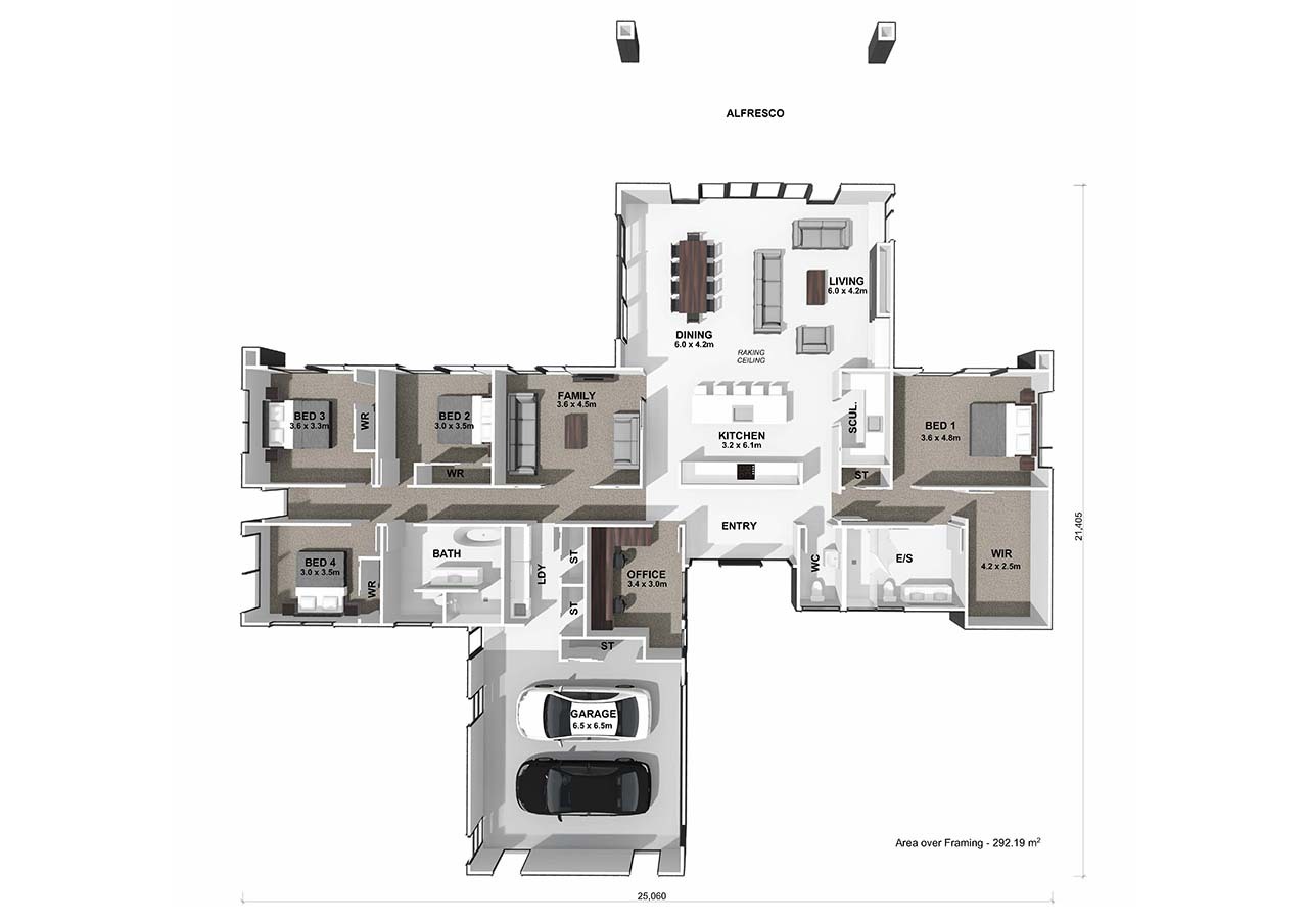 The Muriwai plan offers a spacious four-bedroom layout, with a stunning open kitchen, dining, and family area right at the heart of the home. Designed to maximise the seamless transition between indoor and outdoor living, it features an extensive alfresco area. Additionally, the home boasts a spacious home office, along with a luxurious ensuite and walk-in wardrobe in the master bedroom.