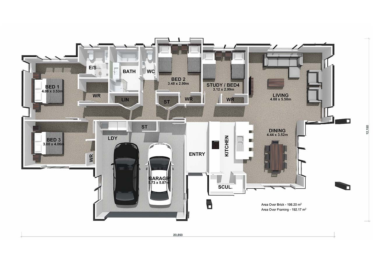 Introducing The Landing, an exquisite four-bedroom home designed to accommodate all of your family's needs. This plan features four spacious bedrooms, including a ensuite and walk-in wardrobe in the master, a modern galley kitchen, an open-plan layout that seamlessly connects the kitchen, dining area, and living space as well as a covered outdoor area. This plan also offers the flexibility to transform one of the bedrooms into a study.